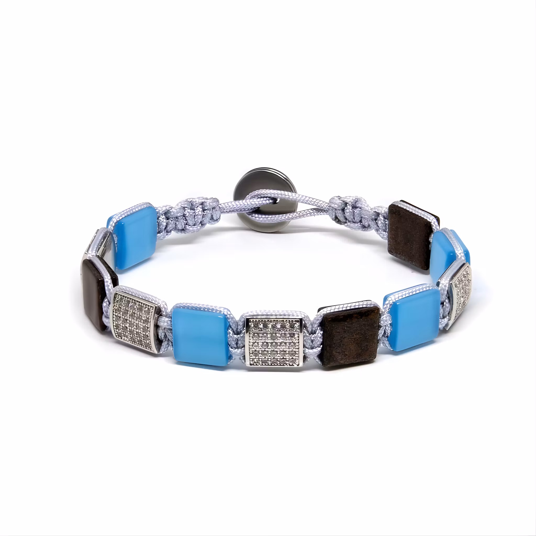 Stilrent och lyxigt brickarmband med blå högblankt polerade halvädelstenar och detaljer i rostfritt stål.
