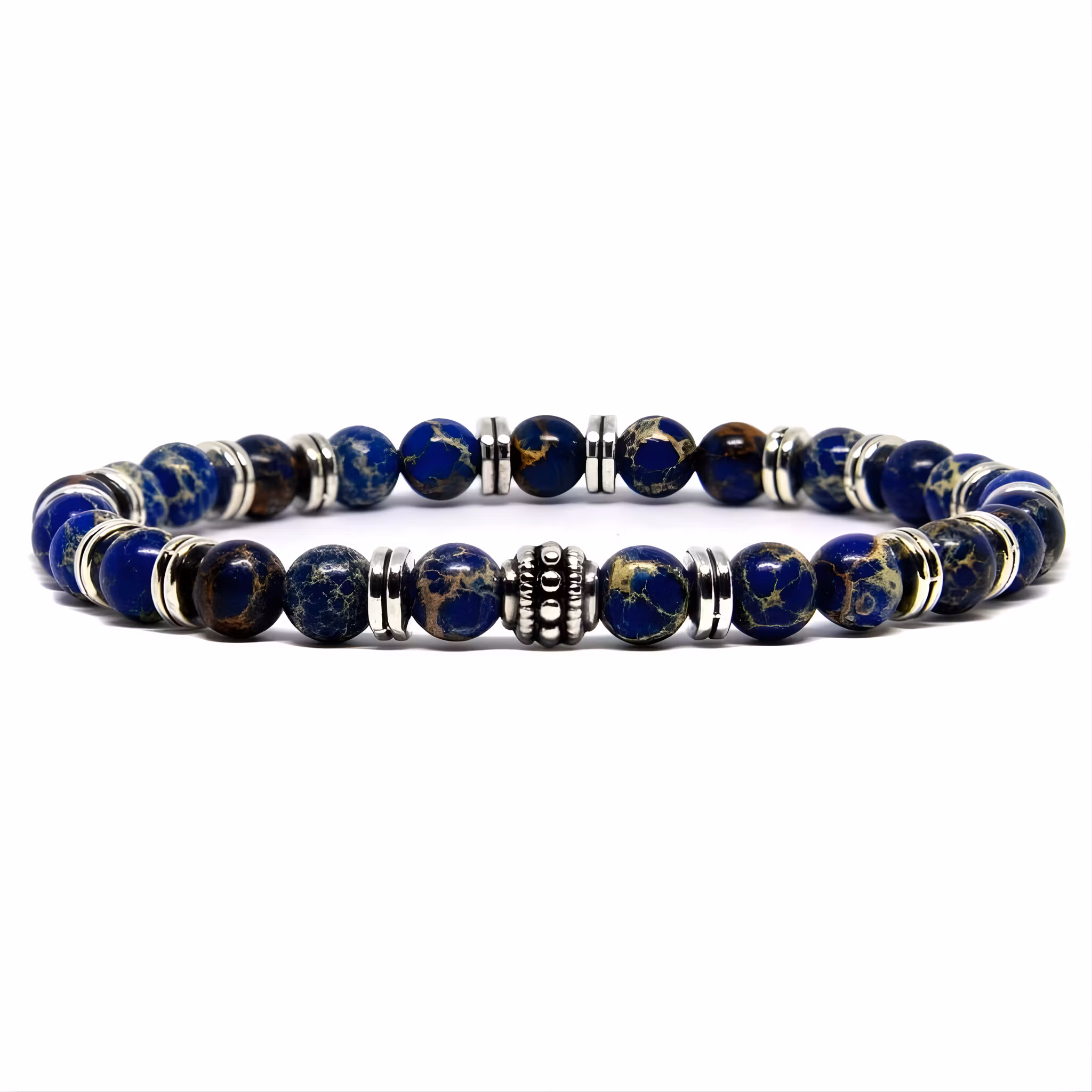 Ett snyggt och karaktärsstarkt armband tillverkat av blå imperial jasper 6mm beads. De blå stenarna innehar samtliga ett unikt mönster, där ingen sten är den andra lik. Dessa egenskaper, tillsammans med övriga detaljer i rostfritt stål, skapar ett mångsidigt armband som kan användas året om och till alla olika tänkbara tillfällen.