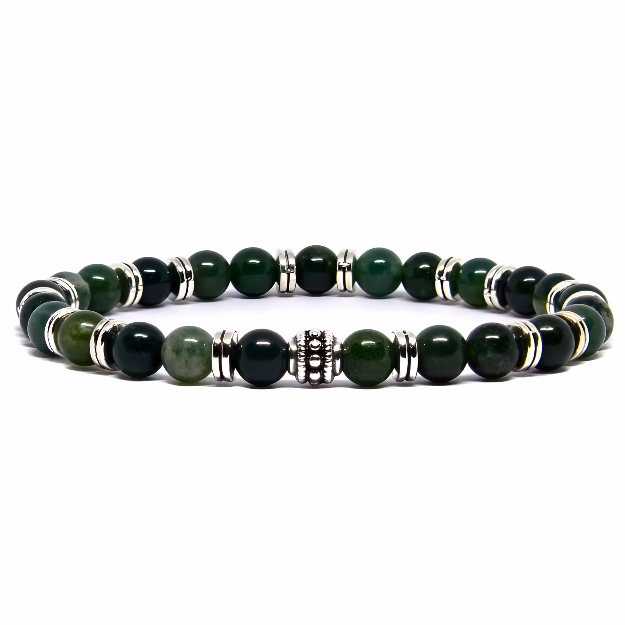 Utforska naturens skönhet med detta tidlösa herrarmband tillverkat av gröna Moss agate stenar. Varje sten är noga utvald för att skapa en unik och naturlig känsla, vilket ger armbandet en distinkt karaktär. Den elastiska tråden garanterar en bekväm passform och gör att armbandet smidigt anpassar sig till din handled. Inspirerat av Falsterbonäset strålar detta armband av en sofistikerad och tidlös aura, vilket gör det till det perfekta tillskottet för den moderna mannen som uppskattar en touch av natur och exklusivitet.