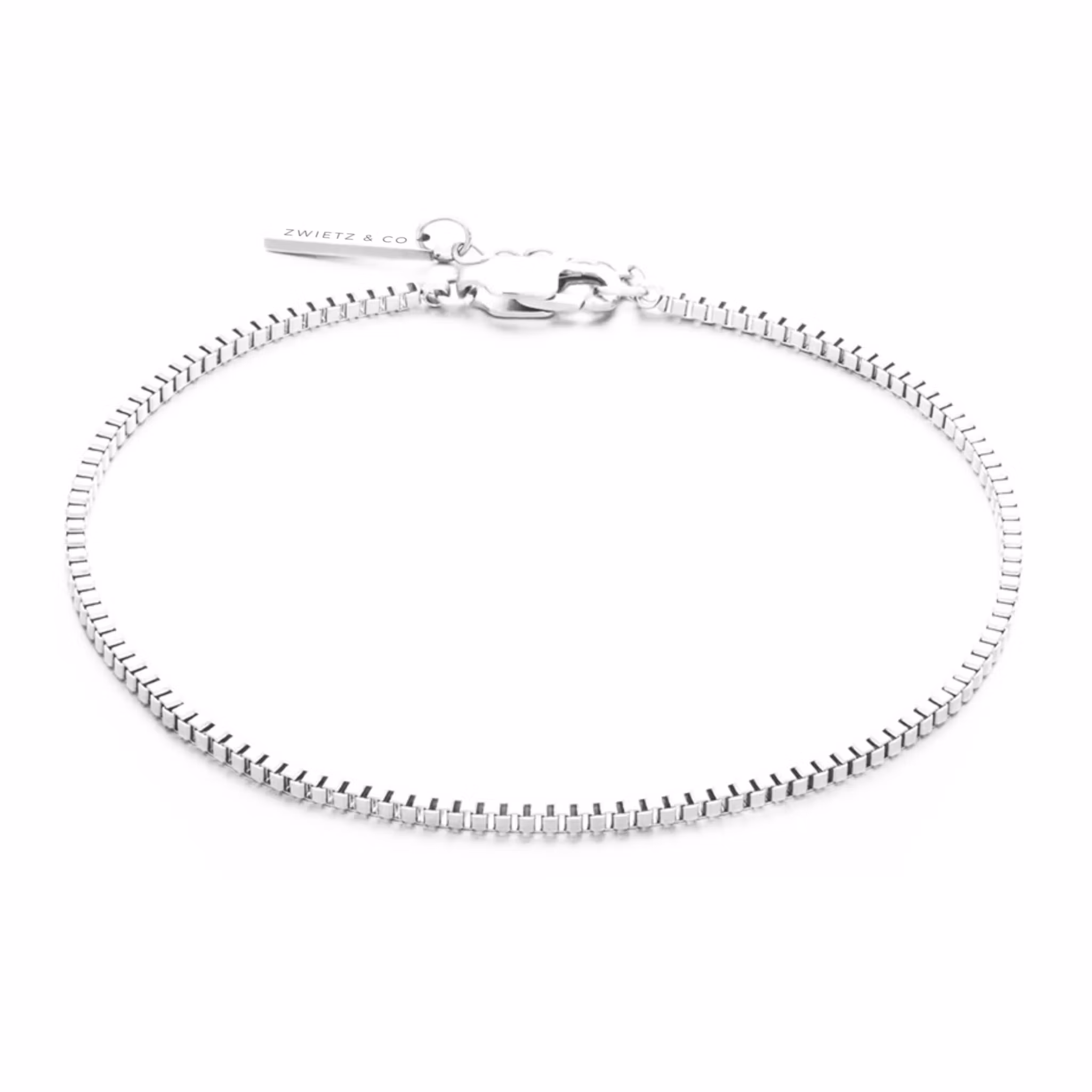 Ett stilrent och tidlöst armband i en klassisk box chain-design som ger ett elegant och sofistikerat uttryck. Den släta, tätt sammanlänkade kedjan reflekterar ljuset subtilt och gör armbandet lika passande till vardags som till mer uppklädda tillfällen.Alla armband levereras i en Zwietz & Co-påse, perfekt för förvaring eller som present.