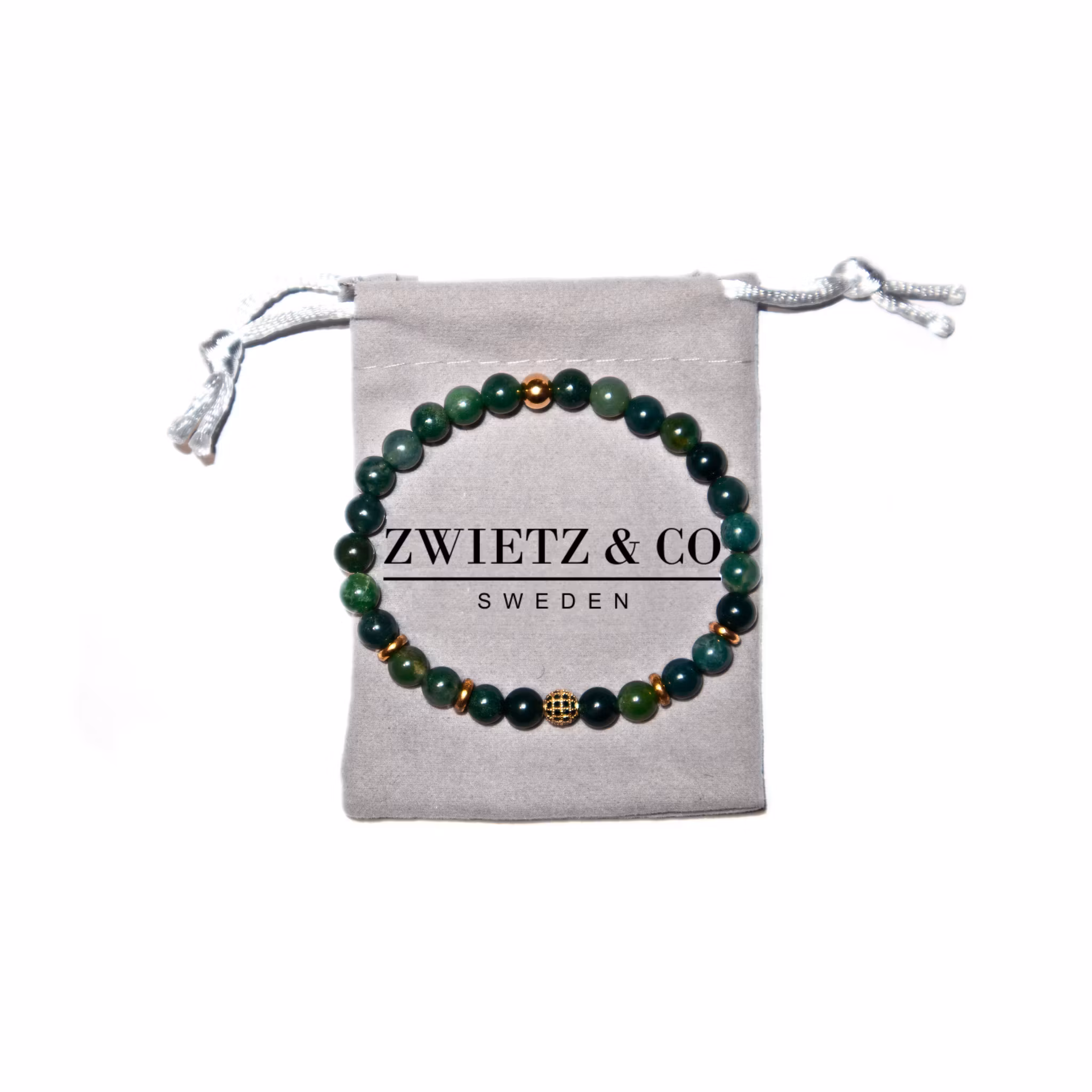 Utforska naturens skönhet med detta tidlösa herrarmband tillverkat av handplockade gröna Moss agate stenar. Varje sten är noga utvald för att skapa en unik och naturlig känsla, vilket ger armbandet en distinkt karaktär. Den elastiska tråden garanterar en bekväm passform och gör att armbandet smidigt anpassar sig till din handled.