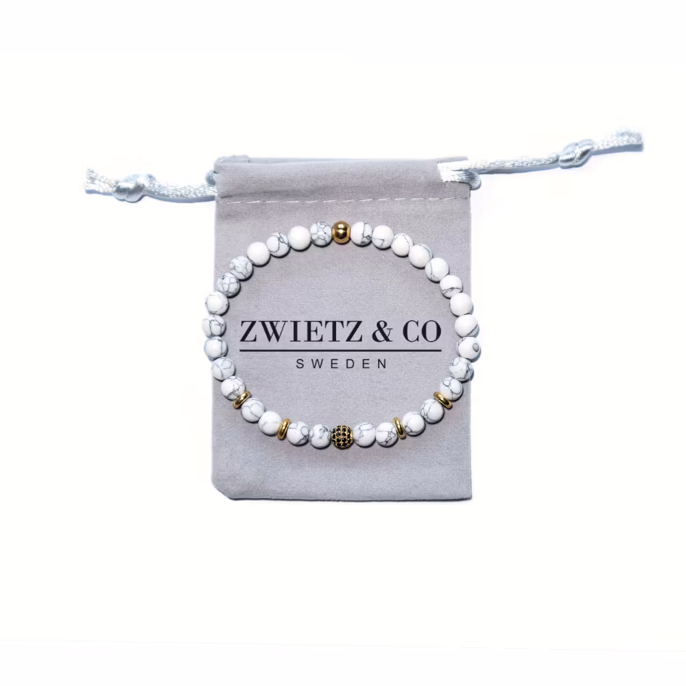 Detta armband är tillverkat av högkvalitativa vita marmorliknande stenar och detaljer i elegant guldfärg. Armbandet är en perfekt kombination av nordiskt minimalistisk design och lyxig estetik. De vita stenarna är handplockade för att säkerställa en jämn och naturlig färgton, vilket ger armbandet en tidlös och sofistikerad look. Stenarnas släta yta ger en behaglig känsla mot huden och ger en elegant kontrast till de glänsande guldfärgade detaljerna.