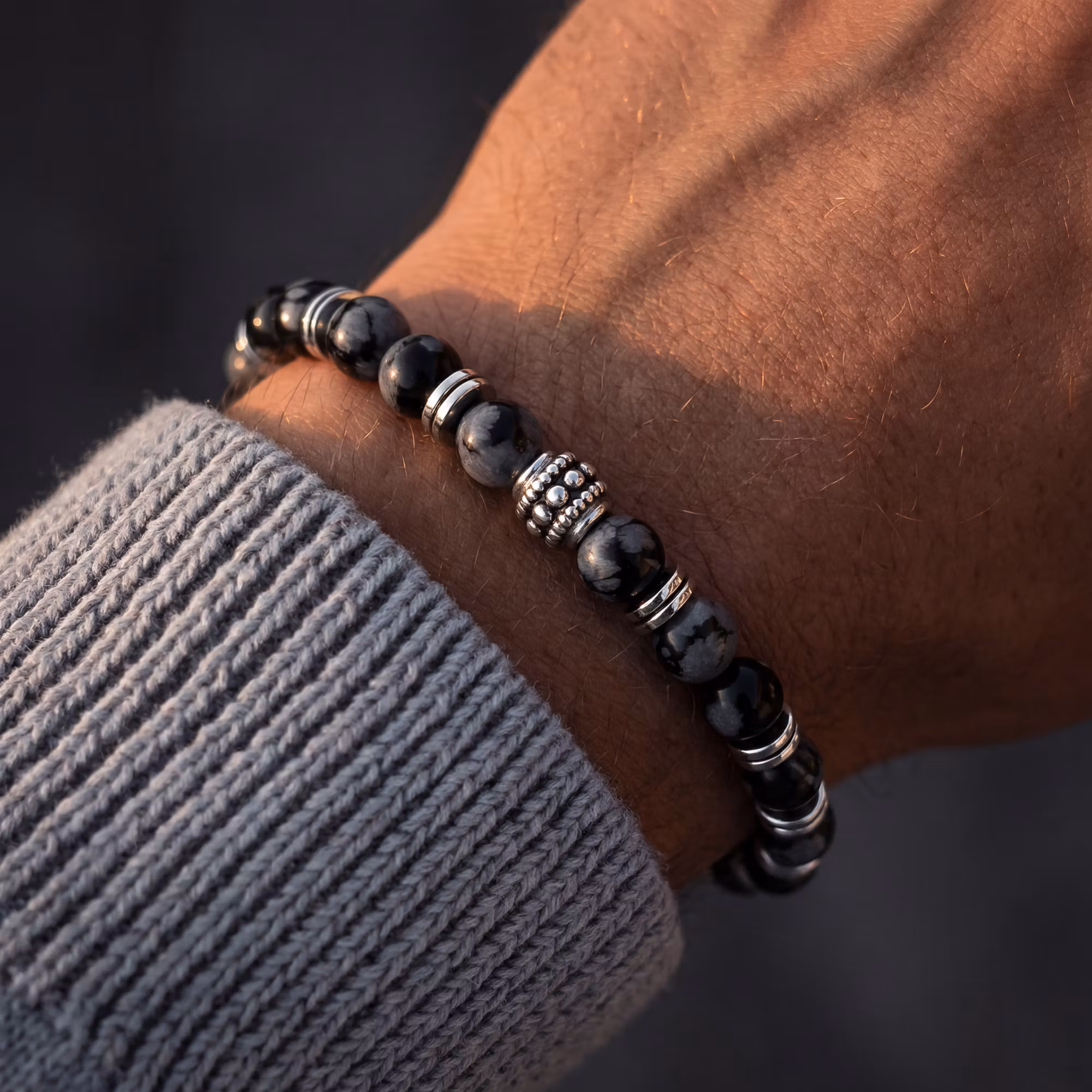 Our Snowflake bracelet is an elegant and unique bracelet made of black snowflake obsidian semi-precious stones. Obsidian is a natural volcanic glassy stone characterized by its dark color and unique patterns. Snowflake obsidian has special white and light gray patterns that resemble snowflakes. The bracelet is an excellent choice for people looking for a unique and stylish accessory with a touch of natural beauty.