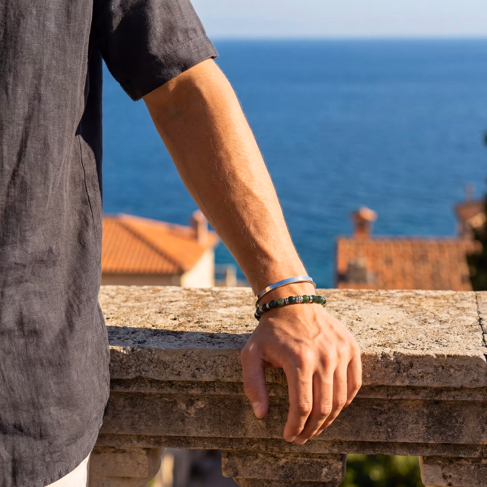 Explore the beauty of nature with this timeless men's bracelet made of green Moss agate stones. Each stone is carefully selected to create a unique and natural feel, giving the bracelet a distinct character. The elastic thread ensures a comfortable fit and allows the bracelet to adapt smoothly to your wrist. Inspired by the Falsterbo Peninsula, this bracelet radiates a sophisticated and timeless aura, making it the perfect addition for the modern man who appreciates a touch of nature and exclusivity.